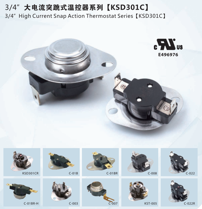 KSD301C SERIES is 3/4" (19mm) bimetal temperature controls. The snap action of the temperature sensing bimetal disc provides high-speed contact separation, resulting in exceptional life characteristics at electrical loads up to 45 amps at 250VAC.